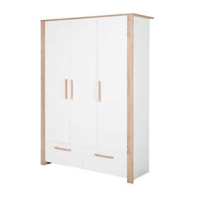 Produktdetails: Der 3-türige Kleiderschrank bietet viel Stauraum für die Klamotten deines Kindes durch seine praktische Einteilung und verstellbaren Böden Aufgrund der Größe kann der fast 2 m hohe Schrank lange über die verschiedene Lebensphasen deines Kindes hinweg genutzt werden Die Türdämpfung sorgt für sanftes Schließen und besonderen Komfort Maße & Gewicht: Breite: 55 cm Länge: 135 cm Höhe: 199 cm Material & Pflege: Material: MDF Material Griffe: Vollholz Farbe: weiß/natur Dekor: Artisan Eiche Im Lieferumfang enthalten: 3 Türen 2 Schubfächer 4 Fachböden 1 Metall-Kleiderstange 5 Böden Achtung: Die Dekoration ist nicht im Lieferumfang enthalten