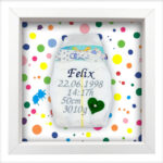 Bestickte Windel im Rahmen als Geschenk zur Geburt Liebevoll gestaltete bestickte Windel mit den Geburtsdaten (Name, Datum, Uhrzeit, Größe, Gewicht) des Babys. Wir besticken die Windeln mit hochwertigen Madeira Garnen und veredeln sie mit süßen Applikationen aus Satin, Filz und/oder Swarovski-Kristallen. Diese bestickte Windel ist veredelt mit: einem Herz, einem Kristall und einer handgebundenen Schleife. Eine bestickte Windel ist das ideale Geschenk zur Geburt, zur Taufe oder auch zu Weihnachten. Bitte trage die Geburtsdaten (Name, Datum, Uhrzeit, Größe, Gewicht) des Babys in die dafür vorgesehenen Felder ein, damit wir dein Geschenk schnell besticken und verschicken können. Wenn du deinen Artikel individualisierst, überprüfe deine Eingaben bitte genau, denn personalisierte Produkte sind leider vom Widerrufsrecht ausgeschlossen. personalisiert individuell