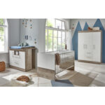 Das Babyzimmer Selina bietet einiges an Stauraum und ein modernes Design. Hier fühlt sich dein Kind sofort wohl. Im Kleiderschrank oder auch in der Wickelkommode findet alles seinen Platz. Die Möbel sind hochwertig verarbeitet und bestehen aus pflegeleichten und teilweise haptischen Oberflächen. Die Kombination aus modernem Weiß und der warmen und schönen Platinum-Oak-Nachbildung schafft eine gemütliche Wohlfühlatmosphäre. Produktdetails: Kinderbett Farbe: weiß / natur Material Kopf- und Fußteil: Holzwerkstoff, melaminbeschichtet Material Gitterseiten und Lattenrost: Massivholz, melaminbeschichtet Liegefläche: Breite x Länge 70 x 140 cm Maße: Breite x Länge x Höhe 76 x 143 x 84 cm Maximale Belastbarkeit: 25 kg 4-fach höhenverstellbares Lattenrost Gitterseiten mit Flachgitterstäben aus Massivholz 3 Schlupfsprossen Made in Germany Wickelkommode Farbe Korpus und Fronten: weiß / natur Farbe Griffe: silber Material Korpus und Fronten: Holzwerkstoff, melaminbeschichtet Material Griffe: Metall Wickelfläche: Breite x Tiefe 85 x 75 cm Maße ohne Wickelaufsatz: Breite x Tiefe x Höhe 115 x 37 x 92 cm Maße mit Wickelaufsatz: Breite x Tiefe x Höhe 115 x 75 x 100 cm Wickelhöhe: 92 cm Maximale Belastbarkeit: 15 kg Links/rechts mit je einer Tür, dahinter 1 Einlegeboden (3-fach höhenverstellbar) Mitte mit einem offenen Fach und 2 Schubladen Wickelaufsatz ist abnehmbar Haptische Dekoroberfläche Made in Germany Kleiderschrank Farbe Korpus und Fronten: weiß / natur Farbe Griffe: silber Material Korpus und Fronten: Holzwerkstoff, melaminbeschichtet Material Griffe: Metall Maße: Breite x Tiefe x Höhe 130 x 51 x 188 cm 3 Türen Links/Mitte mit einem festen Boden, einer Kleiderstange und 2 Schubladen Rechts mit einem festen Boden, 2 Einlegeböden (3-fach höhenverstellbar) Haptische Dekoroberfläche Made in Germany Im Lieferumfang enthalten: Kinderbett Lattenrost Wickelkommode Kleiderschrank Achtung: Matratze, Bettkasten, Umbauseiten und Dekoration sind nicht im Lieferumfang enthalten