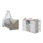 Produktdetails: Sparset in Eiche-Sand-Optik Made in Germany Kinderbett 4-fach höhenverstellbarer Lattenrost 3 Schlupfsprossen Umbaubar zum Juniorbett mit separat erhältlichen Umbauseiten Kommode 2 Schubladen 1 offenes Fach 2 Einlegeböden Abnehmbarer Wickelaufsatz Produktdetails: Kinderbett Farbe: Eiche Sand / weiß Material Korpus: Spanplatte, melaminbeschichtet Material Gitterstäbe: Massivholz, lasiert Liegefläche: Breite x Länge 70 x 140 cm Maße: Breite x Länge x Höhe 78 x 142 x 75 cm Kommode Farbe: Eiche Sand / weiß Material: Spanplatte, melaminbeschichtet Maße ohne Wickelaufsatz: Breite x Tiefe x Höhe 115 x 39 x 93 cm Maße mit Wickelaufsatz: Breite x Tiefe x Höhe 115 x 78 x 99 cm Wickelaufsatz Farbe: Eiche Sand Material: Spanplatte, melaminbeschichtet Maße: Breite x Tiefe x Höhe 88 x 78 x 6 cm Wickelfläche: Tiefe x Breite 75 x 85 cm Wickelkommodenregal Farbe: Eiche Sand Material: Spanplatte, melaminbeschichtet Maße: Breite x Tiefe x Höhe 36 x 35 x 91 cm 3 offene Fächer Im Lieferumfang enthalten: Kinderbett Lattenrost Kommode Wickelaufsatz Wickelkommodenregal Achtung: Matratze, Umbauseiten und Dekoration sind nicht im Lieferumfang enthalten