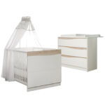 Wave Natur – natürliche Formen Unser erster Ausflug zum Meer mit der ganzen Familie wird für uns alle immer eine der wertvollsten Erinnerungen im Fotoalbum bleiben. Voller Stolz haben wir die höchste Sandburg gebaut und das größte Eis gegessen, haben mit der Sonne um die Wette gestrahlt und in Schwimmflügeln die Weltmeere erobert. Unser neues Kinderzimmer Wave Natur lässt all diese Kindheitserinnerungen in natürlichen Formen und nordischer Leichtigkeit für dein Kleines zur Wirklichkeit werden. Kleine Piraten und Meerjungfrauen können von hier aus die Weltmeere erobern und Kinderträume wahr werden lassen. Produktdetails: Kinderbett: Farbe Korpus und Fronten: Dekor weiß Farbe Blenden: natur Fronten: weiß lackiert Blenden: farbig lackiert Material Koprus: Spanplatte Material Gitterteile: Buche massiv, lackiert Maße: Breite x Länge x Höhe 75 x 142 x 80 cm Liegefläche: Breite x Länge 70 x 140 cm Maße: Breite x Länge x Höhe cm 3-fach höhenverstellbares Lattenrost 3 Schlupfsprossen Umbaubar zum Juniorbett, mit separat erhältlichen Umbauseiten Made in Germany Wickelkommode: Farbe Korpus und Fronten: Dekor weiß Farbe Blenden: natur Fronten: weiß lackiert Blenden: farbig lackiert Material: Spanplatte Maße: Breite x Länge x Höhe 108,5 x 45,5 – 77,5 x 89 cm 3 Schubkästen mit Soft-Close-System Oberster Schubkasten mit Vollauszug und 3-facher Aufteilung Wickelaufsatz ist abnehmbar Made in Germany Im Lieferumfang enthalten: Kinderbett Lattenrost Wickelkommode Achtung: Matratze und Dekoration sind nicht im Lieferumfang enthalten.