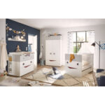 Das Kinderzimmer Till überzeugt durch moderne Optik und pflegeleichte Oberflächen. Die Möbel zeichnen sich durch viel Stauraum aus, sodass alles seinen Platz findet. Das coole Design wird die Augen deines Lieblings zum Leuchten bringen. Technische Details: Made in Germany Garantiert Nachhaltig Kinderbett Farbe: weiß matt lack / asteiche Material: Spanplatte, melaminbeschichtet Material Seitenteile und Lattenrost: Massivholz Liegefläche: Breite x Länge 70 x 140 cm Maße: Breite x Länge x Höhe 78 x 145 x 93 cm 3-fach höhenverstellbares Rost 3 Schlupfsprossen Seitenteile mit breiten Sprossen Umbaubar zum Juniorbett Wickelkommode Farbe: weiß matt lack / asteiche Material: Spanplatte, melaminbeschichtet Maße ohne Wickelaufsatz: Breite x Tiefe x Höhe 102 x 45 x 91 cm Maße mit Wickelaufsatz: Breite x Tiefe x Höhe 102 x 77 x 99 cm Wickelfläche: Breite x Tiefe 87 x 75 cm Wickelhöhe: 91 cm Wickelaufsatz abnehmbar 2 Schubladen mit Selbsteinzug 1 Schublade mit Push to open Kleiderschrank Farbe: weiß matt lack / asteiche Material: Spanplatte, melaminbeschichtet Maße: Breite x Tiefe x Höhe 130 x 51 x 197 cm 1 Kleiderstange 2 Schubladen mit Push to open 3 Türen mit Absetzung 2 Einlegeböden 3 Kontruktionsböden Wandboard Farbe: weiß matt lack Material: Spanplatte, melaminbeschichtet Maße: Breite x Tiefe x Höhe 102 x 16 x 10 cm Ablagefläche: Breite x Tiefe ca. 96 x 14 cm Unterstellregal Farbe: weiß matt lack Material: Spanplatte, melaminbeschichtet Maße: Breite x Tiefe x Höhe 25 x 22 x 89 cm Maße der offenen Fächer: Breite x Tiefe x Höhe 21 x 22 x 26 cm 3 offene Fächer Umbauseiten Farbe: weiß matt lack Material: Spanplatte, melaminbeschichtet Maße: Breite x Länge x Höhe 16 x 139 x 2 cm Im Lieferumfang enthalten: Kinderbett Lattenrost Kommode Wickelaufsatz Kleiderschrank Wandboard 2 Unterstellregale Umbauseiten Achtung: Dekoration und Matratze sind nicht im Lieferumfang enthalten
