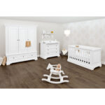 Mit viel Liebe zum Detail entwickelt, testet, produziert und vermarktet Pinolino sein hochwertiges Sortiment an Kindermöbeln, Accessoires und Spielwaren und gestaltet damit seit 1997 die Lebensräume der Kleinsten. Dabei steht Pinolino für die Werte Familie, Glück, Sicherheit und Individualität. Die Pinolino-Plus-Garantie beinhaltet die Verlängerung der gesetzlichen Gewährleistungsfrist auf 10 Jahre ab dem Kaufdatum. Sie beweist, wie überzeugt das Unternehmen von der hervorragenden Qualität seiner Produkte ist. Die Serie ‚Emilia‘ ist in vier Kinderzimmer – Varianten sowie in zwei Sparset – Varianten erhältlich. Erweiterbar ist die Serie ‚Emilia‘ durch ein schönes Wand- oder Standregal. Produktdetails: Kinderbett Farbe: weiß, edelmatt Material: MDF, lackiert Maße: Breite x Länge x Höhe 81 x 151 x 88 cm Liegefläche: Breite x Länge 70 x 140 cm 3 Schlupfsprossen 3-fach höhenverstellbar Mit aufwendig gearbeiteten Zierleisten und geschwungenen Sockelelementen Umbaubar zum Juniorbett und zum Kindersofa Wickelkommode breit Farbe: weiß, edelmatt Material: MDF, lackiert Maße: Breite x Tiefe x Höhe 119 x 78 x 101 cm Wickelhöhe: 94 cm Wickelaufsatz abnehmbar Wickelaufsatz wahlweise links, mittig oder rechts montierbar 3 Schubkästen Self-Soft-Close Mit aufwendig gearbeiteten Zierleisten und geschwungenen Sockelelementen Hochwertige Möbelknöpfe aus Metall Kleiderschrank 3-türig Farbe: weiß, edelmatt Material: MDF, lackiert Maße: Breite x Tiefe x Höhe 166 x 58 x 208 cm 3 Türen 4 höhenverstellbarer Einlegeboden 1 Kleiderstange 2 Schubkästen Self-Soft-Close und Soft-Close Mit aufwendig gearbeiteten Zierleisten und geschwungenen Sockelelementen Hochwertige Möbelknöpfe aus Metall Im Lieferumfang enthalten: Kinderbett Lattenrost Umbauseiten Wickelkommode breit Wickelaufsatz Kleiderschrank 3-türig Achtung: Wandregal, Matratze und Dekoration sind nicht im Lieferumfang enthalten.