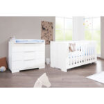 Mit viel Liebe zum Detail entwickelt, testet, produziert und vermarktet Pinolino sein hochwertiges Sortiment an Kindermöbeln, Accessoires und Spielwaren und gestaltet damit seit 1997 die Lebensräume der Kleinsten. Dabei steht Pinolino für die Werte Familie, Glück, Sicherheit und Individualität. Die Pinolino-Plus-Garantie beinhaltet die Verlängerung der gesetzlichen Gewährleistungsfrist auf 10 Jahre ab dem Kaufdatum. Sie beweist, wie überzeugt das Unternehmen von der hervorragenden Qualität seiner Produkte ist. Produktdetails: Kinderbett: Farbe: Edelmatt, weiß Material: Mitteldichte Holzfaserplatte, lackiert Maße: Breite x Länge x Höhe 76 x 148 x 82 cm Liegefläche: Breite x Länge 70 x 140 cm Lattenrost 3-fach höhenverstellbar auf 13 / 25 / 43 cm 3 Schlupfsprossen Umbaubar zum Juniorbett und Kindersofa Inklusive Umbauseiten Pflegehinweis: Feucht abwischen und mit einem trockenem Tuch nachfahren Wickelkommode: Farbe: Edelmatt, weiß Material: Mitteldichte Holzfaserplatte, lackiert Maße: Breite x Tiefe x Höhe 100 x 74 x 108 cm Wickelfläche: Breite x Tiefe 85 x 75 cm Wickelhöhe: 90cm Wickelaufsatz ist abnehmbar 3 Sicherheitsränder 2 Schubkästen 1 Schubkasten mit einer passenden Wäscheeinteilung Self-Soft-Close-Funktion Hochwertige Aluminium-Griffleisten Bodenfreit: 4 cm Pflegehinweis: Feucht abwischen und mit einem trockenem Tuch nachfahren Im Lieferumfang enthalten: Kinderbett Umbauseiten Wickelkommode Achtung: Matratze und Dekoration sind nicht im Lieferumfang enthalten.