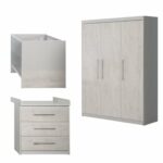 Das roba Kinderzimmer „Maren 2“ überzeugt mit seiner zeitlosen, 2-farbigen Optik im Dekor weiß gekalkte Eiche mit Echtholzhaptik und modernem Lichtgrau. Das Set besteht aus einem Kombi-Kinderbett, breiter Wickelkommode und 3-türigem Kleiderschrank. Das mitwachsende Kinderbett kann zum Juniorbett umgebaut werden und findet bis zum 7. Lebensjahr (bzw. einem Gewicht von 50 kg) Verwendung. Besonders angenehm um dein Baby aus dem Bett zu heben ist die obere Position des 3-fach höhenverstellbaren Gitterbetts. Die drei herausnehmbaren Schlupfsprossen ermöglichen deinem Kind den sicheren Ein- und Ausstieg. Das Kinderbett entspricht den aktuellen Sicherheitsstandards nach EN 716 – 1:2017 + AC:2019. Die Wickelkommode ohne sichtbare Schrauben, mit Wickelaufsatz und hochwertigen Edelstahl-Relinggriffen macht mit ihrer angenehmen Wickelhöhe von 90 cm die Babypflege für Eltern und Baby zum Vergnügen. Aufgrund des offenen Fachs, der beiden Schubladen und des Stauraums hinter der Tür ist bei der Babypflege alles schnell griffbereit. Ohne Wickelaufsatz dient der Wickeltisch als Kommode. Die Wickelkommode entspricht den aktuellen Sicherheitsstandards nach EN 12221 – 1+2:2008 + A1:2013. Der 3-türige Kleiderschrank mit hochwertigen Edelstahl-Relinggriffen bietet viel Stauraum im Kinder- oder Babyzimmer. Die Kleiderstange und die sechs Fachböden sorgen für Ordnung im Kinderkleiderschrank. Aufgrund seiner Höhe von 1,90 m wächst der Schrank bis zum Erwachsenwerden mit. Produktdetails: Kombi-Kinderbett Farbe: grau Untere Seitenteile mit Echtholzstruktur Material Korpus: Spanplatte, melaminbeschichtet Material Seitengitter: Schichtholz Liegefläche: Breite x Länge 70 x 140 cm Maße: Breite x Länge x Höhe 76 x 142 x 80 cm Kopf- und Fußteil teilbar 3-fach höhenverstellbar 3 Schlupfsprossen Belastbar bis zu 50 kg Umbaubar zum Juniorbett mit separat erhältlichen Umbauseitent Kommode Farbe: grau Material: Spanplatte melaminbeschichtet Material Griffe: Edelstahl Maße ohne Wickelaufsatz: Breite x Tiefe x Höhe 88,5 x 39 x 98 cm Maße mit Wickelaufsatz: Breite x Tiefe x Höhe 88,5 x 75 x 98 cm Wickelhöhe: Höhe 90 cm 1 Tür 1 offenes Fach 2 Schubladen 1 Boden Wickelaufsatz Farbe: grau Material: Spanplatte melaminbeschichtet Wickelfläche: Breite x Tiefe 85 x 75 cm Maße: Breite x Tiefe x Höhe 87 x 75 cm Kleiderschrank Farbe: grau Fronten mit Echtholzstruktur Material: Spanplatte, melaminbeschichtet Material Griffe: Edelstahl Maße: Breite x Tiefe x Länge 131 x 52 x 190 cm 3 Türen 1 Kleiderstange 6 Einlegeböden Im Lieferumfang enthalten: Kombi-Kinderbett Lattenrost Kommode Wickelaufsatz Kleiderschrank Achtung: Matratze und Dekoration sind nicht im Lieferumfang enthalten