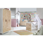 Umgeben von feinen Farben – rosa und blau! Natürlich, sanft und bildschön. So präsentiert sich das neue Kinderzimmer Timber Pinie. Hinter der natürlichen Holz-Optik verbirgt sich ein praktisches Raumwunder, denn viel Platz für Alltagsgegenstände für unsere Kleinen sind bei Schrank und Wickelkommode garantiert. Moderne Griffe in Kupfer runden das natürliche Erscheinungsbild modern ab. Produktdetails: Made in Germany Schardt als Testsieger „nachhaltiges Engagement“ Auszeichnung Schardt „höchste Weiterempfehlung“ von Kunden Kinderbett Farbe: weißgrau / Henson Pine Material: MDF Dekor, melaminbeschichtet Material Gitterstäbe: Buche massiv, lackiert Liegefläche: Breite x Länge 70 x 140 cm Maße: Breite x Länge x Höhe 77 x 145 x 83 cm 3-fach höhenverstellbar 3 Schlupfsprossen Umbaubar zum Juniorbett Inklusive Umbauseiten Wickelkommode Farbe: weißgrau / Henson Pine Material: MDF Dekor, melaminbeschichtet Maße ohne Wickelaufsatz: Breite x Tiefe x Höhe 124 x 53 x 102 cm Maße mit Wickelaufsatz: Breite x Tiefe x Höhe 124 x 70 x 102 cm Wickelhöhe: 94 cm Wickelaufsatz abnehmbar 2 Türen mit Soft-Close-Funktion 2 Einlegeböden 4 Schubladen mit Push-to-Open-Funktion Kleiderschrank 3-türig Farbe: weißgrau / Henson Pine Material: MDF Dekor, melaminbeschichtet Maße: Breite x Tiefe x Höhe 124 x 53 x 194 cm 3 Türen mit Soft-Close-System 2 Schubladen mit Selbsteinzug 2 Kleiderstangen 7 Böden Im Lieferumfang enthalten: Kinderbett Umbauseiten Kommode Wickelaufsatz Kleiderschrank Achtung: Matratze und Dekoration sind nicht im Lieferumfang enthalten