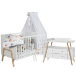 Design Highlight! Die Kindermöbelserie Holly Nature ist in der Kombination weiß mit Massivholzrahmen ein echtes Schmuckstück im KInderzimmer. Optische Farbauswahl vereiint mit praktischen Seitenregalen an der Wickelkommode an dem geräumigen dreitürigen Schrank macht Holly zum Bestseller.Diese Kindermöbelserie braucht wenig Platz. Produktdetails: Made in Germany Schardt als Testsieger „nachhaltiges Engagement“ Auszeichnung Schardt „höchste Weiterempfehlung“ von Kunden Kombi-Kinderbett Farbe: weiß / holzfarben Material: Buche, massiv, Melamin Dekor Liegefläche: 70 x 140 cm Maße (Breite/Länge/Höhe): 77 x 151 x 86,5 cm 3-fach verstellbares Rost 3 Schlupfsprossen Umbaubar zum Juniorbett; Länge: 140 cm Wickelkommode mit Wickelaufsatz Farbe: weiß / holzfarben Material: Melamin Dekor Maße (Höhe/Breite/Tiefe): 100 x 125 x 53 cm Maße mit Wickelaufsatz (Tiefe/Breite/Höhe): 70 x 125 x 100 cm Wickelhöhe: 92 cm 3 Sicherheitsränder 2 Schubladen mit Selbsteinzug 1 große Ablagefläche 2 Seitenregale Im Lieferumfang enthalten: Kombi-Kinderbett 70 x 140 cm Lattenrost Umbauseiten 140 cm Wickelkommode Wickelaufsatz Achtung: Matratze und Dekoration sind nicht im Lieferumfang enthalten