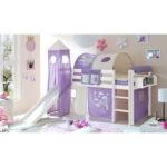 Dieses Bett ist mehr als nur ein komfortabler Schlafplatz für dein Kind! Der Vorhang, die Rutsche und der Tunnel regen die Phantasie und den Spieltrieb des Kindes an und lassen das Hochbett schnell zum Mittelpunkt des Kinderzimmers werden. Der Turm verleiht dem Hochbett den Charme einer Burg und dem Besitzer leuchtende Augen. Dank Massivholz und Wasserlack ist es natürlich langlebig und kinderfreundlich. Produktdetails: Rutschbett Farbe: weiß Material: Kiefer massiv, lackiert Liegefläche: Breite x Länge 90 x 200 cm Maße ohne Turm: Breite x Länge x Höhe 217 x 206 x 114 cm Maße mit Turm: Breite x Länge x Höhe 217 x 206 x 195 cm Maximale Matratzenhöhe: 18 cm Pfostenstärke: 4,5 x 4,5 cm Nischenhöhe: 72 cm Inklusive Rutsche Leiter und Rutsche sind wahlweise rechts oder links montierbar Praktischer Stauraum unter der Liegefläche Zu diesem Bett werden ausschließlich die TiCAA Rollroste empfohlen. Nicht für feste Lattenrahmen geeignet Stoffset Farbe: lila Design: Horse Material: 100% Baumwolle Besteht aus Vorhangstoff und Turm Im Lieferumfang enthalten: Rutschbett Vorhangstoff Turm Achtung: Rollrost, Matratze, Tunnel, Tasche, Nackenrolle und Dekoration sind nicht im Lieferumfang enthalten