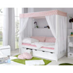 Dieses schöne Himmelbett kann optisch absolut überzeugen. Stabilität und Verarbeitung gewähren dir lange Freude an diesem Bett und süße Träume! Produktdetails: Himmelbett Farbe: weiß / rosa Material: Kiefer massiv, lackiert Liegefläche: Breite x Länge 90 x 200 cm Maße: Breite x Länge x Höhe 97,5 x 211 x 182 cm, inkl. Dachüberstand Max. Matratzenhöhe 18 cm Pfostenstärke: 5,4 x 5,4 mm Bodenfeiheit: 31 cm Oberer Teil abnehmbar und als Einzelbett stellbar 5 Schubladen Belastbarkeit: max. 75 kg, je Liegefläche Zu diesem Bett werden ausschließlich die TICAA Rollroste empfohlen. Nicht für Lattenrahmen geeignet Himmel Farbe: weiß / rosa Material: 100% Baumwolle Material Vorhang: 100% Polyester Pflegehinweis: Vorhang bei 30 °C Handwäsche waschbar Im Lieferumfang enthalten: Himmelbett Himmel Achtung: Rollrost, Matratze und Dekoration sind nicht im Lieferumfang enthalten