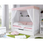 Dieses schöne Himmelbett kann optisch absolut überzeugen. Stabilität und Verarbeitung gewähren dir lange Freude an diesem Bett und süße Träume! Produktdetails: Himmelbett Farbe: weiß Material: Kiefer massiv, lackiert Liegefläche: Breite x Länge 90 x 200 cm Maße: Breite x Länge x Höhe 97,5 x 211 x 182 cm, inkl. Dachüberstand Max. Matratzenhöhe 18 cm Pfostenstärke: 5,4 x 5,4 cm Bodenfreiheit: 31 cm Mit Zusatzbett Oberer Teil abnehmbar und als Einzelbett stellbar Belastbarkeit: max. 75 kg, je Liegefläche Zu diesem Bett werden ausschließlich die TiCAA Rollroste empfohlen. Nicht für Lattenrahmen geeignet Himmel Farbe: rosa / weiß Material: 100% Baumwolle Material Vorhang: 100% Polyester Im Lieferumfang enthalten: Himmelbett Himmel Achtung: Rollrost, Matratze und Dekoration sind nicht im Lieferumfang enthalten