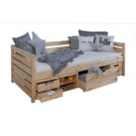 Das Sofabett Naomi eignet sich ideal für Jugend- und Gästezimmer. Nachts bietet das Bett eine gemütliche Liegefläche und genügend Platz, tagsüber eine komfortable Sitzgelegenheit. Unter der Liegefläche finden sich praktische Schubkästen in verschiedenen Ausführungen die für extra Stauraum unter dem Bett sorgen. Maße: B97 x H70 x L209 cm Lieferumfang: Sofabett inkl. Funktionsschubkästen, Montagematerial und Montageanleitung (ohne Rollrost und Matratze) Sofabett mit hohen Seiten- und Rückenteil Kann dank des Aufbaus tagsüber als gemütliches Sofa genutzt werden Aus hochwertigen und massiven Kiefernholz gefertigt Liegefläche von 90×200 cm Inkl. Funktionsschubkästen auf Rollen