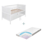 Produktdetails: Kinderbett Höhenverstellbarkeit: 3-fach höhenverstellbar auf 12 cm, 32 cm oder 45 cm Langlebige Materialien: Lattenrost aus hochelastischen Federholzleisten und langlebigem, stabilem, furniertem Schichtholz Kinderleichter Ein- und Ausstieg: Drei Schlupfsprossen für einen einfachen Aus- und Einstieg deines Kindes Farbe: weiß, welche sich mit unterschiedlichen Designs kombinieren lässt Modernes Design: Sichtbare Holzstruktur in schönem schlichten Design Langfristige Nutzung: Umbaubar zum Juniorbett, um das Bett möglichst lange und nachhaltig nutzen zu können Kontrollierte Lackierung: Die Lackierung ist schweiß- und speichelfest sowie schadstofffrei Aufbauanleitung Matratze Besonderes Prinzip: weiche Ober- und Unterschicht, dazwischen eine festere Mittelschicht für den Druckausgleich Hohe Luftfeuchtigkeit: horizontale und vertikale Oberflächenbelüftung sorgt für gutes Atmungsklima und ist allergikerfreudnlich Baby- und Kleinkindseite: vermindert das Risiko von Schädigungen des Knochenbaus Nutzung: Babyseite 0 – 18 Monate, Kleinkindseite > 18 Monate Öko-Tex Standard 100: zertifiziert mit der Prüfnummer S07-0696 in FI Hohenstein Maße & Gewicht: Kinderbett Bett: 74 x 144 x 80 cm (Breite x Länge x Höhe) Liegefläche: 70 x 140 cm Abstand der Gitterstäbe: 5,5 cm Matratze Maße: 70 x 140 x 10 cm (Breite x Länge x Höhe) Material & Pflege: Kinderbett Rahmen: Kiefer massiv, lasiert Kopf- und Fußteil: HDF, lasiert Das FSC®-zertifizierte Kinderbett ist aus Rohstoffen aus nachhaltig und verantwortungsvoller Forstwirtschaft gefertigt. Zur Reinigung und Pflege ein feuchtes Tuch und mildes Reinigungsmittel wie eine Seifenlauge benutzen Matratze Babyseite Kaltschaum-Noppenprofil Zwischenschicht: Polyurethan-Schaumkern Kleinkindseite: Kaltschaum Bezug: Lyocell TENCEL® Fresh & Dry (35% Lyocell (TENCEL®) und 65% Polyester) Bezug abnehmbar und teilbar Bezug waschbar bis 60°C (Schonwaschgang) Im Lieferumfang enthalten: Bett, Lattenrost, vier Umbauklötze und Matratze Zerlegte Lieferung zur Selbstmontage, eine leicht verständliche Aufbauanleitung ermöglicht eine problemlose Montage Achtung: Dekoration ist nicht im Lieferumfang enthalten