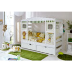 Dieses Bett ist mehr als nur ein komfortabler Schlafplatz für dein Kind! Der Vorhang regt die Phantasie und den Spieltrieb deines Kindes an und lässt das Hausbett schnell zum Mittelpunkt des Kinderzimmers werden. Dank Massivholz und Wasserlack ist es natürlich langlebig und kinderfreundlich. Produktdetails: Hausbett Farbe: weiß Material: Kiefer massiv, lackiert Liegefläche: Breite x Länge 90 x 200 cm Maße: Breite x Länge x Höhe 213 x 100 x 165 cm Pfostenstärke: 50 x 50 cm Max. Matratzenhöhe 18 cm 2 Schubladen Oberer Teil ist abnehmbar und kann als Einzelbett benutzt werden Zu diesem Bett werden ausschließlich die TiCAA Rollroste empfohlen. Nicht für Lattenrahmen geeignet Vorhang Farbe: Mehrfarbig mit Motiv Design: Safari Material: 100% Baumwolle Pflegehinweis: Vorhang bei 30 °C Handwäsche waschbar Im Lieferumfang enthalten: Hausbett Vorhangstoff 2 Schubladen Achtung: Kissen, Matratze, Rollrost und Dekoration sind nicht im Lieferumfang enthalten