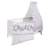 Dieses Komplettbett lässt dein Kind mit Sicherheit tief und fest schlafen. Das Bett besteht aus massiver Kiefer und lässt sich umbauen zum Juniorbett. Produktdetails: Kinderbett Farbe: weiß Material Rahmen: Kiefer massiv Material Kopf- und Fußteil: HDF-Platten Material Lattenrost: hochelastische Federholzleisten aus furniertem Schichtholz Liegefläche: 70 x 140 cm Maße: Breite x Länge x Höhe 74 x 144 x 80 cm 3-fach höhenverstellbar 3 Schlupfsprossen Abstand der einzelnen Gitterstäbe: 5,5 cm Umbaubar zum Juniorbett FSC-Zertifizierung: A000531 Matratze Maße: Breite x Länge x Höhe 70 x 140 x 7 cm Material: PU-Weichschaum Der Bezug ist abnehmbar Material: 100 % Baumwolle Waschbar bei 30° C, nicht trocknergeeignet Bettset 3-teilig Farbe: bunt Design: Bärle Bettwäsche: Breite x Länge 40 x 60 / 100 x 135 cm Material: 100 % Baumwolle Waschbar bis 60° C, trocknergeeignet Nestchen Material: 100 % Baumwolle, Füllung 100 % Polyestervlies Waschbar bis 30° C, nicht trocknergeeignet Himmel Material: 100 % Polyestervoile Waschbar bis 30° C, nicht trocknergeeignet Im Lieferumfang enthalten: Kinderbett Matratze Lattenrost 4 Umbauklötze Himmelstange aus Metall 3-teiliges Bettset: Bettwäsche, Nestchen und Himmel Achtung: Einziehkissen und Einziehdecke sind nicht im Lieferumfang enthalten.