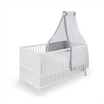 Das urra Komplettbett Luna lasst dein Kind mit Sicherheit tief und fest schlafen. Das Bett besteht aus massiver Kiefer und lässt sich kinderleicht zu einem Juniorbett umbauen. So habt Ihr viel länger etwas von dem Bett. Das Lattenrost ist praktischerweise 3-fach höhhenverstellbar auf 16 cm, 35 cm und 47 cm. Zudem hat eines der Seitenteile drei herausnehmbare Schlupfsprossen, um den kleinen Schatz später das Heraussteigen zu vereinfachen. Das Bett wird zerlegt für eine Selbstmontage geliefert. Eine leicht verständliche Aufbauanleichtung ermöglicht eine problemlose Montage. Produktdetails: Kinderbett: Gesamtmaße: Breite x Länge x Höhe 74 x 144 x 80 cm Liegefläche: 70 x 140 cm Farbe: weiß, lackiert Material Rahmen: Kiefer massiv Material Kopf- und Fußteil: HDF-Platten Material Lattenrost: hochelastische Federholzleisten aus langlebig, stabilen furniertem Schichtholz Lattenrost: 3-fach höhenverstellbar auf 16 cm, 35 cm und 47 cm Drei herausnehmbare Schlupfsprossen Abstand der einzelnen Gitterstäbe: 5,5 cm Umbaubar zum Juniorbett FSC-Zertifizierung: A000531 Matratze: Material Kern: 100% PU-Weichschaum Liegefläche: Breite x Länge x Höhe 70 x 140 x 7 cm Material: Bezug 100% Baumwolle Bezug abnehmbar und waschbar Bettset 3-teilig: Farbe: weiß / bunt Design: Mond und Sterne Bettwäsche (Kissen 40 x 60 cm / Decke 100 x 135 cm): 100% Baumwolle Nestchen: Bezugsstoff aus 100% Baumwolle, Füllung 100% Polyestervlies Himmel: 100% Polyestervoile Himmelstange: Metall Bettwäsche waschbar bis 60 °C Trocknergeeignet Himmel und Nestchen waschbar bis 30 °C Im Lieferumfang enthalten: Kinderbett Lattenrost 4 Umbauklötze Matratze Bettwäschengarnitur Nestchen Himmelstange Himmel Achtung: Einziehkissen und -decke sind im Lieferumfang nicht enthalten.
