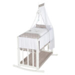 Das roba Stubenbett Babysitter 4 in 1, ‘Indibär‘ ist Beistellbett zum Elternbett, Wiege, Babybett und Kinderbank in einem. Das Bettchen kommt inklusive Schaummatratze, Bettwäsche im niedlichen Design aus ‘Indibär‘, Inlett, gepolstertem Nestchen, Himmel und Himmelstange sowie mit Kufen zum Wiegen. Das Beistellbett lässt sich mit den mitgelieferten Gurten leicht und sicher am Elternbett befestigen und kann nicht verrutschen. Durch eine Höhenverstellung von 42,5 cm bis hin zu unbegrenzter Betthöhe inkl. Boxspringbetten, lässt sich das Stubenbett optimal auf die Höhe der Elternmatratze einstellen und mit einer flexiblen und unsichtbaren Befestigung am Elternbett anbringen. Mittels mitgelieferter Kufen lässt sich das Stubenbett einfach zur Wiege umfunktionieren. Die liebevoll gestalteten Textilien im Design ‘Indibär‘ des Babysitter 4 in 1 bieten ein optimales Schlafklima. Die 2-teilige Bettwäsche besteht aus Kopfkissen 40×35 cm und Zudecke 80×80 cm. Das Kindersteppbett ist aus einer atmungsaktiven und temperaturausgleichenden Klimafaser-Füllung aus 100% Polyester gefertigt. Der Bezugstoff besteht aus 100% Baumwolle. Das Steppbett ist das ganze Jahr über nutzbar sowie strapazierfähig und pflegeleicht, da es durch die Steppung beim Waschen nicht verrutscht. Das roba 4 in 1 Stubenbett ist von Geburt an geeignet und wächst mit bis zur Kinderbank für größere Kinder. Das Multifunktionstalent lässt sich zudem einfach montieren (ca. 30 Minuten). Das Stubenbett sowie die komplette Ausstattung ist nach den aktuellsten Sicherheitsstandards nach Norm EN 1130:2019 entwickelt und produziert. Alle verwendeten Materialien des roba Stubenbett Babysitter 4 in 1 sind schadstoffgeprüft, zertifiziert und werden regelmäßig kontrolliert. Das roba Stubenbett ‘Indibär‘ mit Flachstäben, ist in der Farbe Weiß lackiert. Der verwendete Lack ist lebensmittelecht und hautverträglich. Die Liegefläche beträgt 90 x 45 cm. Gesamtmaße: Höhe mit Himmel 145 cm x Breite (ohne/mit Kufen) 50/76 cm x Tiefe 95 cm. Produktdetails: Stubenbett: Farbe: natur Material Liegefläche: MDF lackiert Material Rahmen / Seitengitter: Schichtholz Material Kufen: Massivholz(Buche) Liegefläche: Breite x Länge 45 x 90 cm Maße ohne Kufen: Breite x Tiefe x Höhe 50 x 95 x 145 cm Maße mit Kufen: Breite x Tiefe x Höhe 76 x 95 x 145 cm Stufenlos höhenverstellbar Verwendbar als Beistellbett, Wiege, Bettchen und Bank 2 Kufen zum Umbauen zur Wiege Bettset: Design: Indibär Maße Bettwäsche: 35 x 40 / 80 x 80 cm Material Bettwäsche: 100% Baumwolle Im Lieferumfang enthalten: Stubenbett Schaummatratze, Nestchen und Bettwäsche Kopfkissen und Bettdecke Himmelstange und Himmel Kufen zum Umbauen zur Wiege
