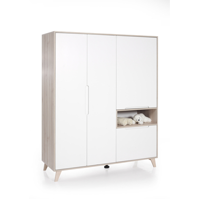 Mette – natürlich spannungsvoll: Mette – noch ein neues Wohlfühl-Lieblingszimmer, das überzeugt durch seine natürliche Optik und die spannungsvoll inszenierten Details. Der moderne Materialmix aus weißen MDF-Fronten und Edelbuche Dekor, sowie die warme Farbgebung, lassen das Kinderzimmer ihres kleinen Schatzes zu einem Ort voller wohliger Geborgenheit und spannungsvoller Dynamik werden. Die eingefrästen Griffe mit den sanften Abrundungen machen die Bedienung, der mit Anschlagsdämpfern ausgestatteten Türen, sehr angenehm für Kind und Eltern. Der extrabreite, dreitürige Kleiderschrank bietet eine Menge Stauraum und die schräg nach außen laufenden Beine verleihen dem Zimmer das gewisse Etwas. Mette belebt das Kindezimmer durch natürlich spannungsvolles Design – jeden Tag aufs Neue. Produktdetails: Farbe: Birdy Buche / weiß Material Korpus: Spanplatte, Dekor Material Fronten: MDF, lackiert Maße: Breite x Tiefe x Höhe 158 x 57,5 x 198 cm 4 Türen mit Soft-Close-System 1 Kleiderstange 1 offenes Fach 4 Einlegeböden Made in Germany Im Lieferumfang enthalten: Kleiderschrank Achtung: Dekoration ist nicht im Lieferumfang enthalten.