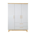 Der roba Kleiderschrank „Caro“ bietet hinter seinen drei Türen mit hochwertigen Massivholzgriffen viel Stauraum im Kinder- oder Babyzimmer. Für sanftes, leises Schließen der Türen und Schubladen sorgt die Tür- und Schubladendämpfung der eingebauten Soft Close-Technik. Die beiden Schubkästen sind ebenfalls mit hochwertigen Massivholzgriffen verstehen und sorgen zusammen mit den vier Fachböden und einem weiteren Fachboden über der Metallkleiderstange für Ordnung im Kinderkleiderschrank. So finden zum Beispiel Socken, Unterwäsche, Kinderspielzeug oder Bücher ihren Platz in den Schubladen. Der 3-türige, lichtgraue Drehtürenschrank mit Sockelrahmen und Deckplatte im Dekor „Goldeiche“ verfügt als besonderes Design-Highlight über eine schwebende Deckplatte. Aufgrund seiner Höhe von 2 m wächst der Schrank bis zum Erwachsenwerden mit und kann auch als Jugendzimmerschrank verwendet werden. Der elegante 3-türige Kleiderschrank lässt sich mit weiteren Baby- und Kindermöbeln aus der Serie „Caro“ perfekt zu einem komplett eingerichteten Baby- oder Kinderzimmer mit mitwachsenden Systemmöbeln erweitern. Der Babyzimmerschrank ist in Deutschland entwickelt, wurde in der EU produziert und ist montagefreundlich. Der Kleiderschrank „Caro“ ist eph zertifiziert und trägt das Qualitätssiegel blauer Engel, das garantiert, dass alle verwendeten Materialien höchste Ansprüche an Umwelt-, Gesundheits- & Gebrauchseigenschaften erfüllen. Produktdetails: Farbe Korpus: lichtgrau Farbe Sockelrahmen/ Deckplatte: goldeiche Material Korpus: Spanplatte, melaminbeschichtet Material Rückwand: HDF Material Böden: Spanplatte, melaminbeschichtet Material Griffe: Buche, massiv Maße: Breite x Tiefe x Höhe 134,5 x 55 x 200 cm 3 Türen mit Soft-Close-Funktion 2 Schubladen mit Soft-Close-Funktion 1 Kleiderstange 5 Böden