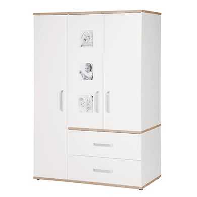 Dekorelemente in Sanremo Eiche Sand sind die Besonderheiten der Möbel aus der roba Kinderzimmerserie Pia. Bei diesem Kinderzimmer wird das besondere Dekor mit technischem Know-how verbunden. Softclose für Türen und Schubladen dürfen hier nicht fehlen. Ein Besonderer Hingucker sind die integrierten Bilderrahmen an einer Tür des Kleiderschranks Pia – bestückt mit persönlichen Fotos wird er zu einem Unikat. Produktdetails: Farbe: Sanremo, weiß Material Korpus + Einlegeböden: Spanplatte, melaminbeschichtet Material Rückwand: HDF Material Griffe: Metall Maße: Breite x Tiefe x Höhe 135 cm x 55 cm x 193 cm 3 Türen mit Soft-Close-Funktion 2 Schubkästen mit Soft-Close-Funktion 5 Einlegeböden 1 Kleiderstange ABC-Schutzkanten Besonderheit: 3 x Bilderrahmen in der Schranktür integriert