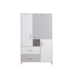 Produktdetails: 3 Türen mit Soft-Close-System 3 Schubladen mit Selbsteinzug und extra starken seitlichen Führungsschienen 4 Böden 2 Kleiderstangen Made in Germany Schardt als Testsieger „nachhaltiges Engagement“ Auszeichnung Schardt „höchste Weiterempfehlung“ von Kunden Technische Details: Farbe: weiß / grau Material: Spanplatte, melaminbeschichtet Maße: Breite x Tiefe x Höhe 112 x 53 x 182 cm Achtung: Dekoration ist nicht im Lieferumfang enthalten