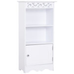 Dieser elegante, kleine Schrank verleiht Ihrem Zuhause einen besonderen Charme. Der weiße Schrank im Landhausstil bietet eine Kombination aus offenem und geschlossenem Stauraum, damit Sie immer alles gut sortiert und griffbereit haben. Die Rankenleiste und die dezent geschwungene Unterkante bezaubern auf subtile Art und Weise. Der robuste Korpus aus MDF- und Spanplatten hat eine wasserabweisende Oberfläche und ist damit für Feuchträume geeignet. Aber auch außerhalb des Badezimmers kann der schmale Schrank glänzen: Ob im Wohnzimmer oder auf dem Flur, Ihren Einrichtungsideen sind keine Grenzen gesetzt! Helles Design mit dezenter Verzierung Kompaktes Design, perfekt für kleine Räume Offener und geschlossener Stauraum in 3 Fächern Optionale Wandbefestigung für mehr Standsicherheit Wasserdichte und pflegeleichte Lackierung