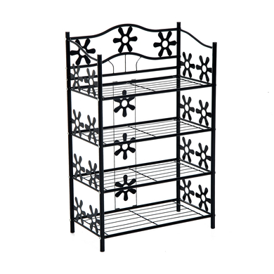 Charmant und vielseitig präsentiert sich unser Blumenregal. Gefertigt aus pulverbeschichtetem Metall zeigt es sich unempfindlich gegenüber Witterungseinflüssen und überzeugt in puncto Verarbeitung und Robustheit. 4 Regalböden bieten Ihnen ausreichend Platz, um Pflanzen, Schuhe oder andere Gegenstände übersichtlich zu platzieren. Nicht nur Blumen finden einen dekorativen Stellplatz in Ihrem Regal. Auch als Badhelfer oder Schuhregal macht es eine gute Figur. Auffallend sind besonders die formschönen Verzierungen, die Ihr Standregal zu einem wahren Hingucker machen. Gut verarbeitet, charmant im Design und klasse im Preis. Mit unserem vielseitigen Pflanzregal holen Sie sich dekorative Eleganz nach Hause. Charmantes Blumenregal: Auch als Schuh- oder Badregal macht es im Innenbereich eine gute Figur. Dekorativ: Dank der formschönen Verzierungen und den auffallend filigranen Linien ist Ihr Standregal eine wahre Augenweide. 4 Böden: So können Sie Ihre Pflanzen, Kräuter oder anderen Gegenstände übersichtlich platzieren. Stabil: Das Material zeigt sich unempfindlich gegenüber Witterungseinflüssen und überzeugt in puncto Verarbeitung und Robustheit. Gesamtmaße: L59,5 x B30 x H92 cm, Fachhöhe 18,5 cm, max. Belastbarkeit 15 kg, Gewicht 3,8 kg