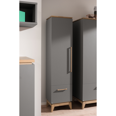 Paidi denkt an die Zukunft. Auf alle aktuellen Paidi Katalog-Programme erhalten Sie 5 Jahre Nachkauf-Garantie und Produkt-Garantie. Ausgenommen sind Textilien und Matratzen. Spiel- und Wohnwelten in den eigenen vier Räumen. Selbstverständlich passen sich die Kinderzimmer komplett an die Bedürfnisse des Bewohners an, wachsen mit und halten über Jahre höchsten Belastungen stand. Für jedes Kinderzimmer-Set erfolgt eine sorgfältige Materialauswahl und PAIDI achtet auf eine einwandfreie sowie kindgerechte Verarbeitung. Das Regal mit Tür und Schublade bietet dank seiner Schrankhöhe noch mehr Stauraum und ist somit die perfekte Ergänzung zum Kleiderschrank, macht aber allein ebenso eine gute Figur. Mit Türanschlag links oder rechts erhältlich. Produktdetails: Farbe: Schiefergrau / Eiche Material Korpus und Fronten: Spanplatte melaminharzbeschichtet Material Griffe, Deckplatte und Sockel: Eiche massiv, lackiert Maße: Breite x Tiefe x Höhe 48,2 x 39,6 x 200 cm Eleganter Schwebeeffekt durch Schattenfuge am Sockel 1 Schublade 3 Einlegeböden 1 Tür Türanschlag links