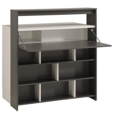 Dieses Multifunktionsregal bietet viel Stauraum und ist eines der besten Möglichkeiten, Bar und Theke miteinander zu verbinden. Maße: B103,5 x H115 x T59/94 cm Lieferumfang: Regal, Montagematerial und Montageanleitung (ohne Dekoration) Vorderseite: Regal mit 8x kleinen Fächern aufklappbares Barfach Rückseite: Regal mit großer Ablagefläche Oberplatte durchgängig bis zum Barfach