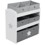 Das roba Spielregal „Stars“ aus lackiertem und bedrucktem MDF ist sowohl ein idealer Ordnungshüter als auch ein toller Blickfang im Kinderzimmer. Ein Regal ist ein nützliches und sinnvolles Möbelstück um ein Kinderzimmer perfekt einzurichten. Mit 5 Stoffboxen ausgestattet, bietet das Aufbewahrungsregal ausreichend Stauraum für loses Spielzeug wie Bauklötze oder Malsachen. Mit dem Spielregal lernen schon die Kleinsten Ordnung im Kinderzimmer zu halten. Dank der großen Metall-Griffösen lassen sich die Stoffboxen leicht herausnehmen und wieder zurück ins Spielzeugregal stellen. Die unterste und größte Stoffbox ist, passend zum Druckmotiv auf den Seitenteilen des Aufbewahrungsregals, mit einem Stern bedruckt. Mit 5 Stoffboxen. Produktdetails: Gesamtmaß Regal: 63,5 x 30 x 60 cm 1 Box mit den Maßen 60 x 24 x 20 cm 4 Boxen mit den Maßen 30 x 24 x 15 cm Material: MDF (lackiert) Mit liebevoller Bedruckung Inklusive 5 Stoffboxen mit Metall-Griffösen Drei Boxen bedruckt