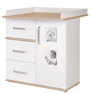 Dekorelemente in Sanremo Eiche sind die Besonderheiten der Möbel aus der roba Kinderzimmerserie Pia. Bei diesem Kinderzimmer wird das besondere Dekor mit technischem Know-how verbunden. Softclose für Türen und Schubladen dürfen hier nicht fehlen. Ein Besonderer Hingucker sind die integrierten Bilderrahmen – bestückt mit persönlichen Fotos wird jedes Möbelstück zu einem Unikat. Die Wickelkommode Pia ist außerdem mit einem Wickelaufsatz ausgestattet. Mit dem roba Seitenregal Pia kann die leere Fläche unter dem Wickelaufsatz optimal ausgenutzt werden. Produktdetails: Farbe: Sanremo Eiche, weiß Material Korpus + Einlegböden + Wickelaufsatz: Spanplatte, melaminbeschichtet Material Rückwand: HDF Maße ohne Wickelaufsatz: Breite x Tiefe x Höhe 94cm x 41cm x 102cm Maße mit Wickelaufsatz: Breite x Tiefe x Höhe 94cm x 78cm x 102cm Wickelfläche: Breite x Tiefe 85cm x 75cm Wickelhöhe: 94cm 3 Sicherheitsränder 3 Schubkästen mit Soft-Close-Funktion 1 Tür mit Soft-Close-Funktion Umbaubar zur Kommode Besonderheit: 2 Bilderrahmen eingearbeitet