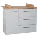 Die roba Wickelkommode mit Wickelaufsatz „Tobi“ macht mit ihrer rückenschonenden Wickelhöhe von 94 cm die Babypflege für Eltern und Baby zum Vergnügen. Die abnehmbare Wickelplatte lässt sich rechts, mittig oder links oben am Wickeltisch montieren. Für sanftes Schließen der Tür und der 3 Schubladen sorgt die eingebaute Soft Close-Technik. Die oberste Schublade des Wickeltisches lässt sich komplett herausziehen und bietet Stauraum für Wickelutensilien. Durch den Vollauszug der oberen Schublade hast du bei der Babypflege alles schnell griffbereit. Mit weiteren Kindermöbeln aus der Serie „Tobi“ lässt sich ein stilvolles Kinder- oder Babyzimmer einrichten. Die roba Wickelkommode mit Wickelaufsatz ist ein wahres Multitalent und leistet dir weitere Jahre gute Dienste. Die stabile Wickelkommode bietet sich als erhöhter Sitzplatz für dein Kindergartenkind an, damit du in einer bequemen Stehposition mühelos beim Anziehen helfen können. Später entpuppt sich der Wickelplatz als Kommode in deinem Wohn- oder Kinderzimmer. Die Wickelkommode mit hochwertigen Metallgriffen und ohne sichtbare Schrauben zählt zu den breiten Wickelkommoden. Die Wickelkommode ist in Deutschland entwickelt und entspricht den aktuellen Sicherheitsstandards nach EN 12221 – 1+2:2008 + A1:2013. Die Wickelkommode „Tobi“ wurde in der EU produziert und ist montagefreundlich. Zusätzlich ist sie eph zertifiziert und trägt das Qualitätssiegel blauer Engel, das garantiert, dass alle verwendeten Materialien höchste Ansprüche an Umwelt-, Gesundheits- & Gebrauchseigenschaften erfüllen. Produktdetails: 1 oberste Schublade mit Vollauszug 2 Schubladen mit Soft-Close-Funktion 1 Tür mit Soft-Close-Funktion Wickelaufsatz rechts, mittig oder links montierbar Technische Details: Farbe Korpus / Fronten: lichtgrau Deckplatte / Wickelaufsatz: Goldeiche Material Korpus + Einlegeböden + Wickelansatz: Spanplatte, melaminbeschichtet Material Rückwand: HDF Material Griffe: Metall Maße ohne Wickelaufsatz: Breite x Tiefe x Höhe 117 x 41 x 104 cm Maße mit Wickelaufsatz: Breite x Tiefe x Höhe 117 x 78 x 102 cm Wickelfläche: 85 x 75 cm Wickelhöhe: 94 cm Im Lieferumfang enthalten: Wickelkommode Wickelaufsatz