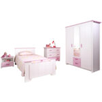 Mit unserem Komplett-Set können wir Ihnen zeigen, wie harmonisch sich auch ein großer Kleiderschrank mit seinen 3 Türen in das Gesamtbild integrieren lässt. Er dominiert keineswegs das Arrangement, sondern verhilft ihm zu ästhetischer Eleganz. Maße: Kleiderschrank (B136 x H181 x T56 cm); Bett (B103 x H79 x T207 cm); Nachtkommode (B48 x H42 x 33 cm); Sideboard (B90 x H79 x T45 cm) Lieferumfang: Kleiderschrank, Bett, Sideboard, Nachtkommode, Montagematerial und Montageanleitung (ohne Matratze, Rollrost und Dekoration) 4-teiliges Kinderzimmer-Set 3-türiger Kleiderschrank mit Mittelwand und Spiegel Oberplatte der Nachtkommode und Sideboard 22 mm