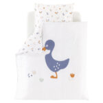 Produktdetails: Stylische Bettwäsche mit Enten und Hühnern Zweiteiliges Set Sanft und weich auf Babys Haut Deckenbezug mit Reißverschluss am Fußende Kissenbezug mit Hotelverschluss zum einfachen Auf- und Abziehen Größe: 80 x 80 / 35 x 40 cm cm Material & Pflege: Material: 100 % Baumwolle Waschbar bei 60° C Für den Trockner geeignet