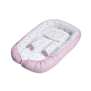 Schutz und Geborgenheit im Elternbett! Gemütliche Stunden versprechen unsere neuen Kuschelnestchen. Weiche Seitenrollen sorgen für zusätzliche Stabilität beim Liegen. Bewegungsfreiheit Ihres Babies ist gewährleistet. Produktdetails: Design: Herzchen rose Material Oberstroff: 100% Baumwolle Material Füllung: 100% Polyestervlies Matratze aus Polyurethan Außenmaß: 90 x 50 cm Innenmaß: 65 x 35 cm Schonwäsche 30 °C, nicht schleudern Matratze vor Waschgang entnehmen Nicht Trockner geeignet