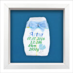 Bestickte Windel im Rahmen als Geschenk zur Geburt Liebevoll gestaltete bestickte Windel mit den Geburtsdaten (Name, Datum, Uhrzeit, Größe, Gewicht) des Babys. Wir besticken die Windeln mit hochwertigen Madeira Garnen und veredeln sie mit süßen Applikationen aus Satin, Filz und/oder Swarovski-Kristallen. Diese bestickte Windel ist veredelt mit: Babyfüßchen, Kristallen und einer handgebundenen Schleife. Eine bestickte Windel ist das ideale Geschenk zur Geburt, zur Taufe oder auch zu Weihnachten. Bitte trage die Geburtsdaten (Name, Datum, Uhrzeit, Größe, Gewicht) des Babys in die dafür vorgesehenen Felder ein, damit wir dein Geschenk schnell besticken und verschicken können. Wenn du deinen Artikel individualisierst, überprüfe deine Eingaben bitte genau, denn personalisierte Produkte sind leider vom Widerrufsrecht ausgeschlossen. personalisiert individuell