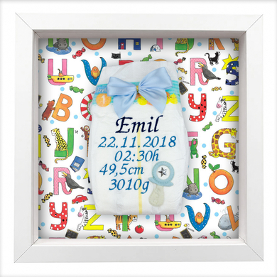 Bestickte Windel im Rahmen als Geschenk zur Geburt Liebevoll gestaltete bestickte Windel mit den Geburtsdaten (Name, Datum, Uhrzeit, Größe, Gewicht) des Babys. Wir besticken die Windeln mit hochwertigen Madeira Garnen und veredeln sie mit süßen Applikationen aus Satin, Filz und/oder Swarovski-Kristallen. Diese bestickte Windel ist veredelt mit: einem Schnuller, einem Stern und einer handgebundenen Schleife. Eine bestickte Windel ist das ideale Geschenk zur Geburt, zur Taufe oder auch zu Weihnachten. Bitte trage die Geburtsdaten (Name, Datum, Uhrzeit, Größe, Gewicht) des Babys in die dafür vorgesehenen Felder ein, damit wir dein Geschenk schnell besticken und verschicken können. Wenn du deinen Artikel individualisierst, überprüfe deine Eingaben bitte genau, denn personalisierte Produkte sind leider vom Widerrufsrecht ausgeschlossen. personalisiert individuell
