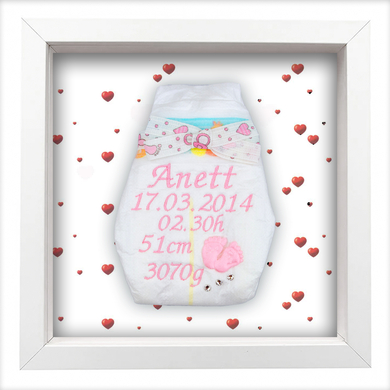 Bestickte Windel im Rahmen als Geschenk zur Geburt Liebevoll gestaltete bestickte Windel mit den Geburtsdaten (Name, Datum, Uhrzeit, Größe, Gewicht) des Babys. Wir besticken die Windeln mit hochwertigen Madeira Garnen und veredeln sie mit süßen Applikationen aus Satin, Filz und/oder Swarovski-Kristallen. Diese bestickte Windel ist veredelt mit: Babyfüßchen, Kristallen und einer handgebundenen Schleife. Eine bestickte Windel ist das ideale Geschenk zur Geburt, zur Taufe oder auch zu Weihnachten. Bitte trage die Geburtsdaten (Name, Datum, Uhrzeit, Größe, Gewicht) des Babys in die dafür vorgesehenen Felder ein, damit wir dein Geschenk schnell besticken und verschicken können. Wenn du deinen Artikel individualisierst, überprüfe deine Eingaben bitte genau, denn personalisierte Produkte sind leider vom Widerrufsrecht ausgeschlossen. personalisiert individuell