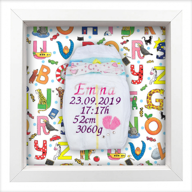 Bestickte Windel im Rahmen als Geschenk zur Geburt Liebevoll gestaltete bestickte Windel mit den Geburtsdaten (Name, Datum, Uhrzeit, Größe, Gewicht) des Babys. Wir besticken die Windeln mit hochwertigen Madeira Garnen und veredeln sie mit süßen Applikationen aus Satin, Filz und/oder Swarovski-Kristallen. Diese bestickte Windel ist veredelt mit: Babyfüßchen, Kristallen und einer handgebundenen Schleife. Eine bestickte Windel ist das ideale Geschenk zur Geburt, zur Taufe oder auch zu Weihnachten. Bitte trage die Geburtsdaten (Name, Datum, Uhrzeit, Größe, Gewicht) des Babys in die dafür vorgesehenen Felder ein, damit wir dein Geschenk schnell besticken und verschicken können. Wenn du deinen Artikel individualisierst, überprüfe deine Eingaben bitte genau, denn personalisierte Produkte sind leider vom Widerrufsrecht ausgeschlossen. personalisiert individuell