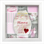 Bestickte Windel im Rahmen als Geschenk zur Geburt Liebevoll gestaltete bestickte Windel mit den Geburtsdaten (Name, Datum, Uhrzeit, Größe, Gewicht) des Babys. Wir besticken die Windeln mit hochwertigen Madeira Garnen und veredeln sie mit süßen Applikationen aus Satin, Filz und/oder Swarovski-Kristallen. Diese bestickte Windel ist veredelt mit: einem Herz, einem Kristall und einer handgebundenen Schleife. Eine bestickte Windel ist das ideale Geschenk zur Geburt, zur Taufe oder auch zu Weihnachten. Bitte trage die Geburtsdaten (Name, Datum, Uhrzeit, Größe, Gewicht) des Babys in die dafür vorgesehenen Felder ein, damit wir dein Geschenk schnell besticken und verschicken können. Wenn du deinen Artikel individualisierst, überprüfe deine Eingaben bitte genau, denn personalisierte Produkte sind leider vom Widerrufsrecht ausgeschlossen. personalisiert individuell