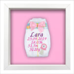Bestickte Windel im Rahmen als Geschenk zur Geburt Liebevoll gestaltete bestickte Windel mit den Geburtsdaten (Name, Datum, Uhrzeit, Größe, Gewicht) des Babys. Wir besticken die Windeln mit hochwertigen Madeira Garnen und veredeln sie mit süßen Applikationen aus Satin, Filz und/oder Swarovski-Kristallen. Diese bestickte Windel ist veredelt mit: einem Schnuller, einem Stern und einer handgebundenen Schleife. Eine bestickte Windel ist das ideale Geschenk zur Geburt, zur Taufe oder auch zu Weihnachten. Bitte trage die Geburtsdaten (Name, Datum, Uhrzeit, Größe, Gewicht) des Babys in die dafür vorgesehenen Felder ein, damit wir dein Geschenk schnell besticken und verschicken können. Wenn du deinen Artikel individualisierst, überprüfe deine Eingaben bitte genau, denn personalisierte Produkte sind leider vom Widerrufsrecht ausgeschlossen. personalisiert individuell