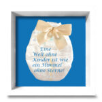 Diese liebvoll gestaltete bestickte Windel im Rahmen ist das perfekte Geschenk zur Geburt für alle, die etwas Besonderes schenken wollen. Sprüche zur Geburt kommen immer gut an und bleiben in Erinnerung. Verziert mit drei echten Swarovski-Kristallen bekommt die bestickte Windel im Rahmen eine ganz besonders wertige Note. Farbe: blau Spruch: Eine Welt ohne Kinder ist wie ein Himmel ohne Sterne. Weitere Sprüche verfügbar. persönlich liebevoll